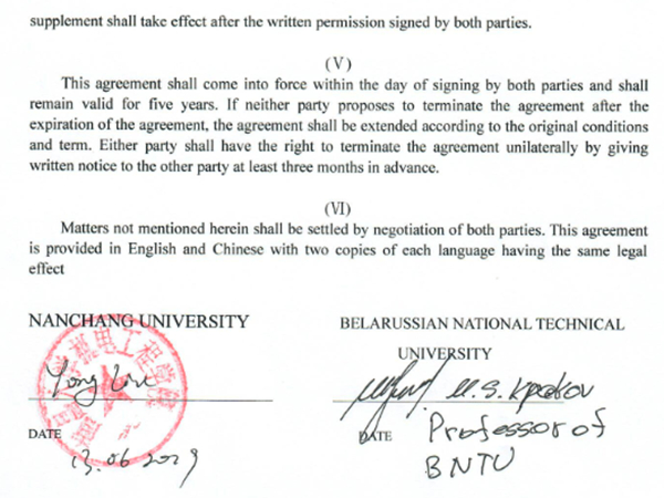 南昌大学机电工程学院分别与俄罗斯科学院西伯利亚分院热物理研究所、白俄罗斯国立技术大学、白俄罗斯信息电子技术大学、乌克兰马卡洛夫国立船舶大学签署了4项合作协议。